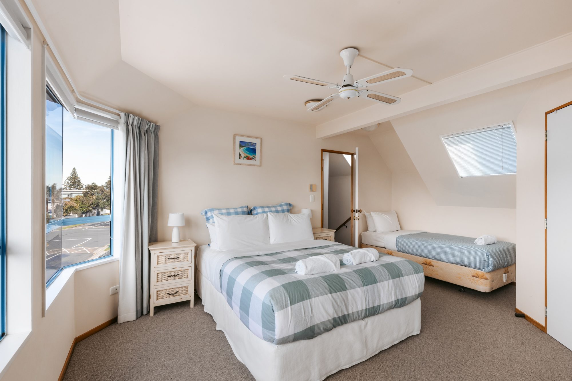 On the ground floor, you’ll find a converted garage with laundry facilities and a cozy queen bedroom. The second level features a bright and airy lounge, a fully equipped kitchen, dining area, and a bunk room. The top floor is home to the master bedroom, complete with a queen bed and a single bed.