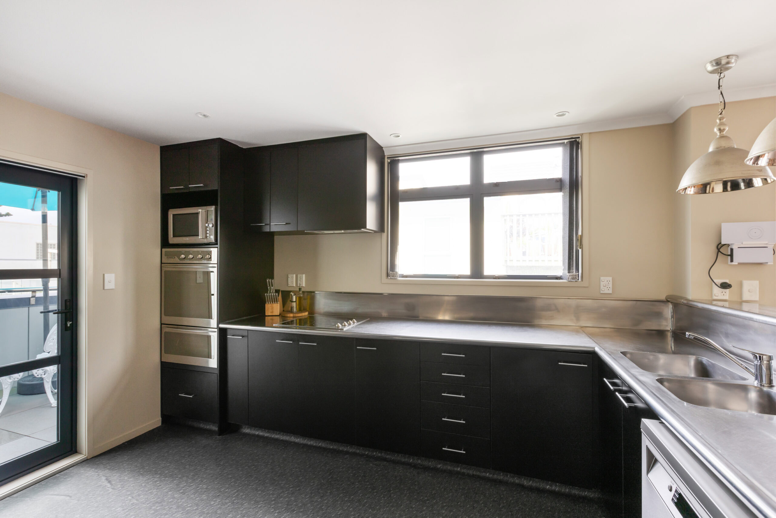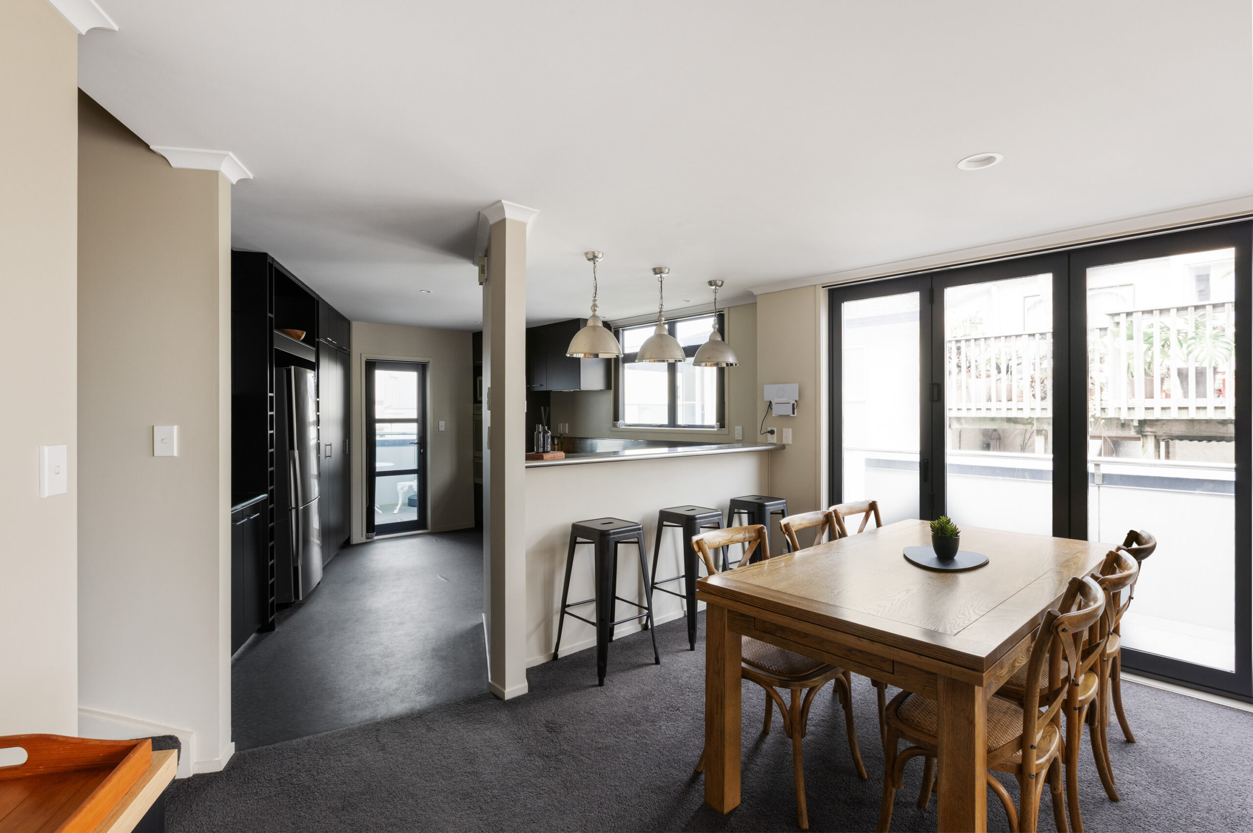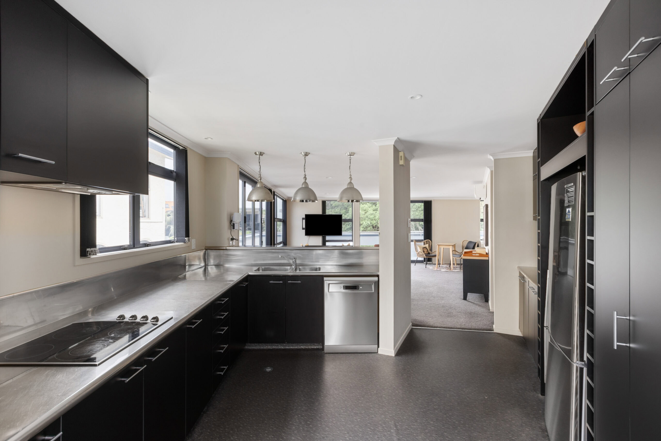 The middle level is the heart of the home, featuring an open-plan kitchen and living area that flows out to an outdoor entertaining deck. With a small table and seating positioned to capture the ocean outlook, it’s ideal for relaxed meals or soaking up the coastal atmosphere.