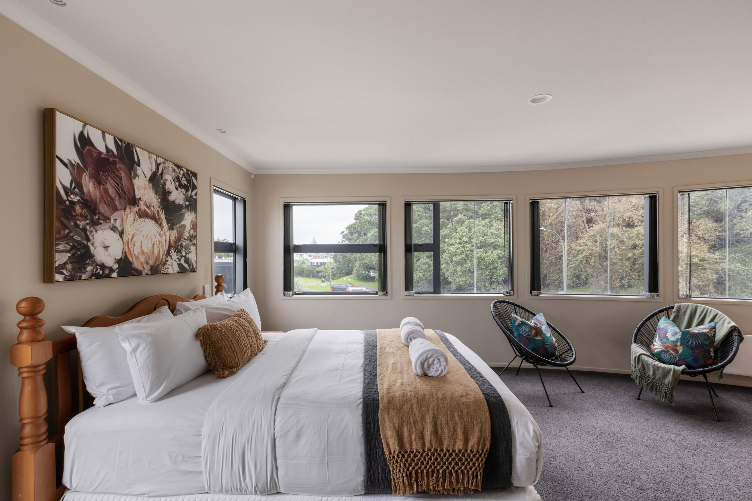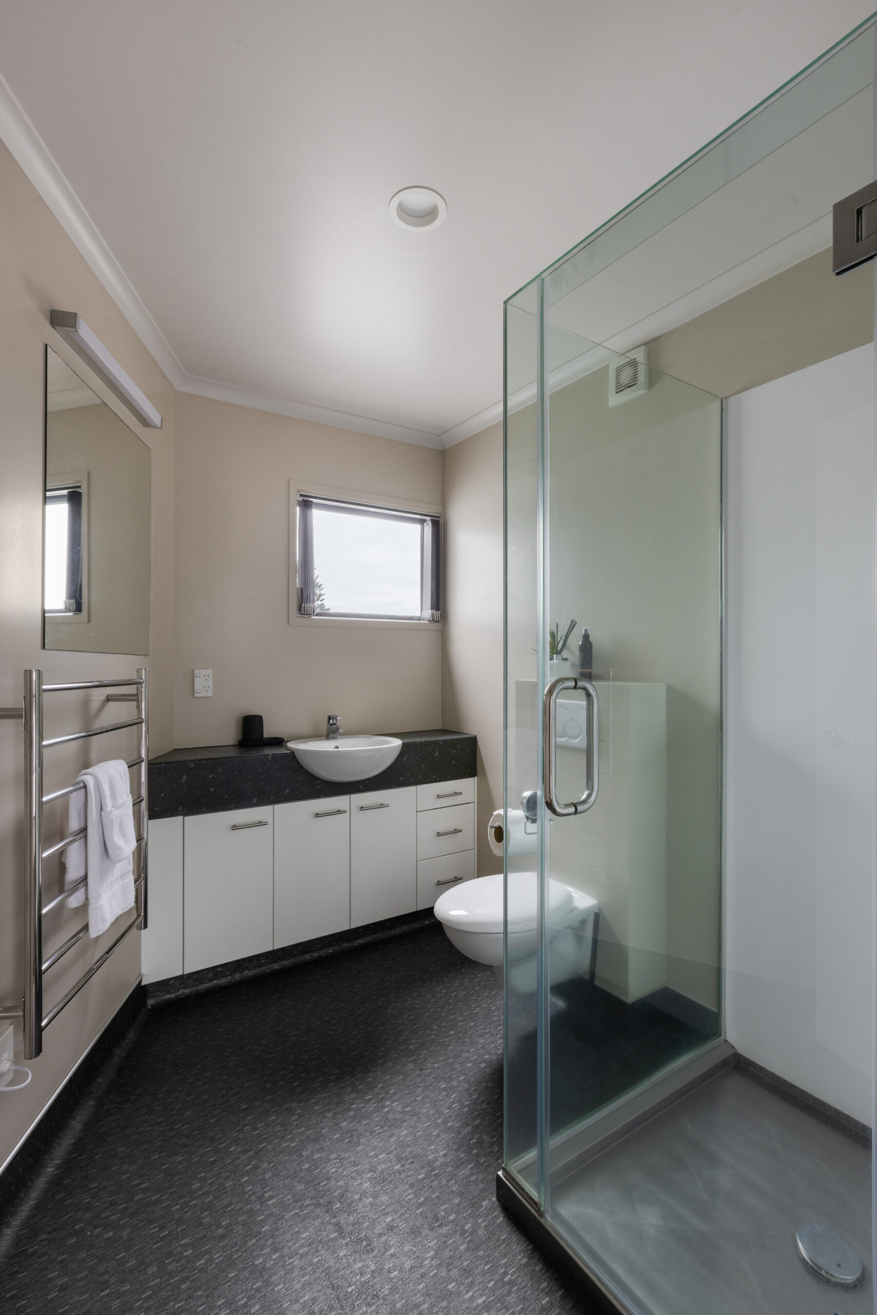 The top level is home to the master retreat, complete with a walk-in wardrobe, private ensuite, and its own deck. From here, take in sweeping views of the ocean, port, and Mount Drury – the perfect spot for a quiet morning coffee or evening unwind.